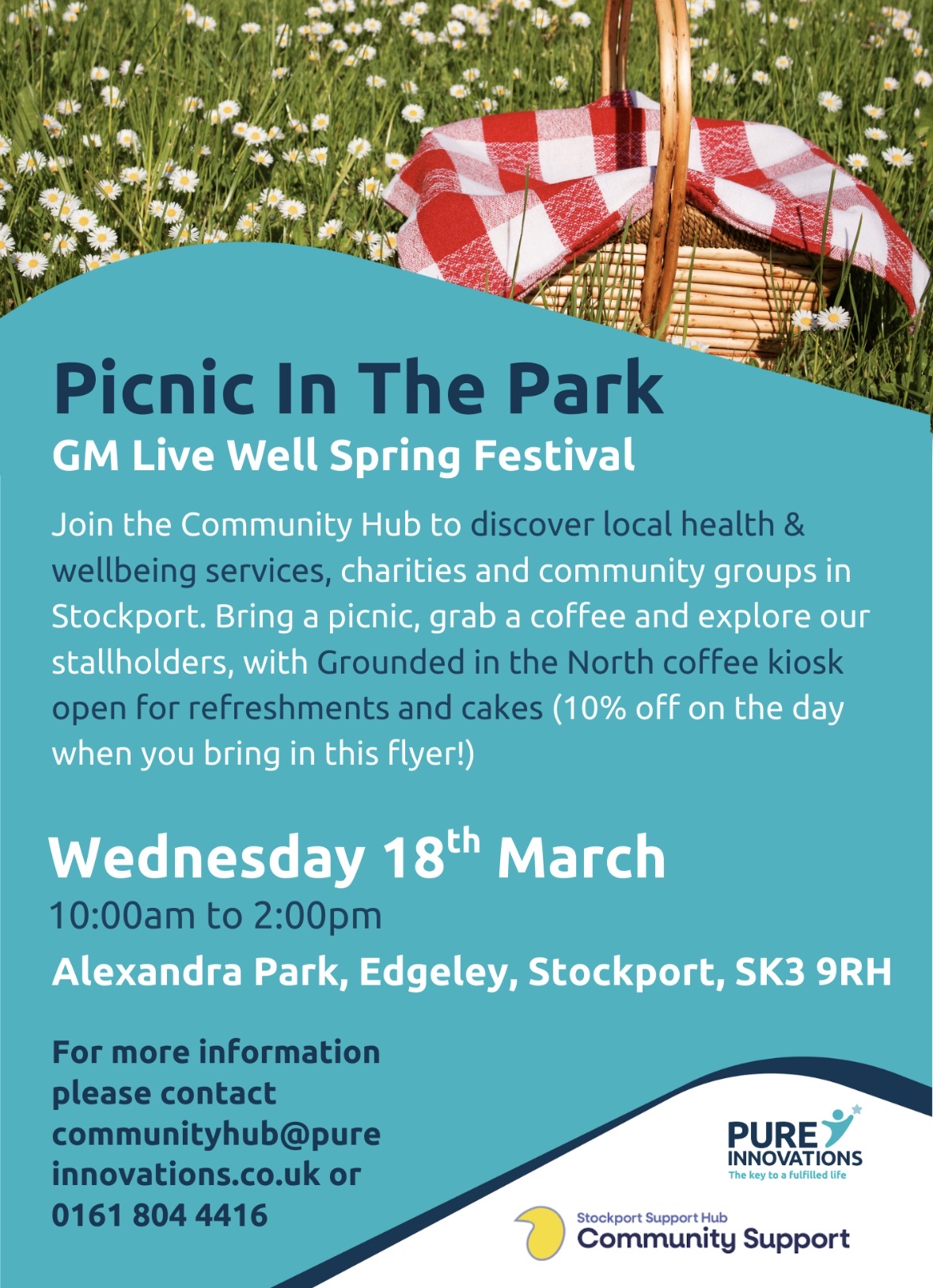 <p><!-- wp:paragraph --></p> <p>Discover local health & wellbeing services and community organisations in Stockport. Don’t forget to bring a picnic!</p> <p><!-- /wp:paragraph --></p> <p><!-- wp:paragraph --></p> <p>Organised by Pure Innovations as part of the Greater Manchester Live Well Spring Festival</p> <p><!-- /wp:paragraph --></p>
